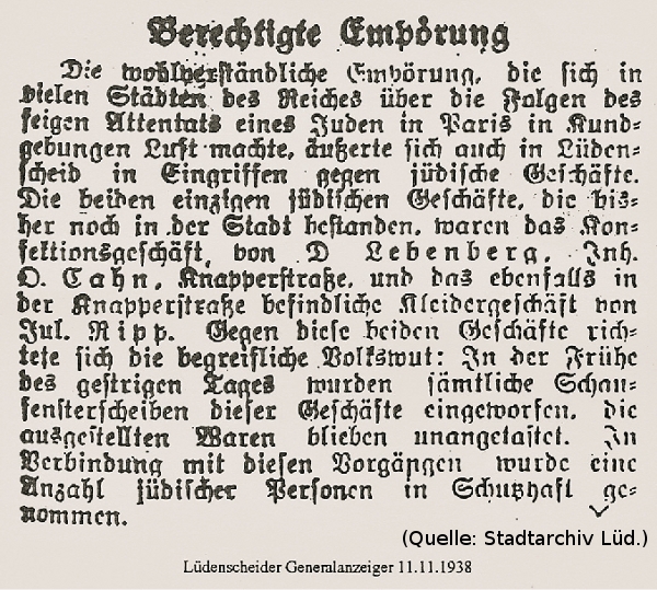 Am Morgen des 10. Novembers fuhr ein Lkw mit SA-Leuten von auswärts, vermutlich von Bochum - der Gauhauptstadt Westfalen-Süd - über die Knapperstraße, wo die beiden Textilgeschäfte Lebenberg und Ripp besetzt und ausgeplündert wurden. Die Textilien lagen auf dem Adolf-Hitler Platz und wurden später von anderen Uniformierten (SS, Gestapo oder Polizei) bewacht. Die Pogromnacht war von Goebbels und der SA als so genannte Empörung des Volkes gegen die Ermordung eines deutschen Botschaftssekretärs durch einen jüdischen Deutschen in Paris organisiert worden.