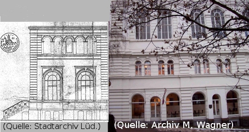 Bis 1985 standen die beiden Gebäude nebeneinander: links der 'Jägerhof', rechts: bis 1936 das Zentralgebäude der Lüdenscheider Konsumgenossenschaft, ab 1937: Stadthaus Lüdenscheid. Im 'Jägerhof' trafen sich 1901 bis 1936 die jüdischen Lüdenscheider zum Gebet und zur Geselligkeit.